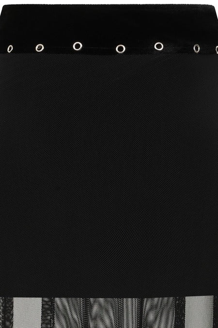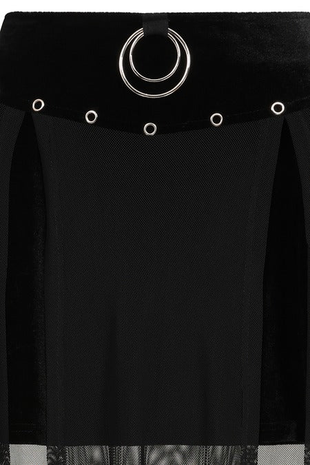 This Banned alternative long skirt exudes a dark, edgy aesthetic. The waistband and top portion are crafted from rich black velvet, giving it a luxurious yet gothic vibe. The waistband features bold silver eyelets that encircle it, adding a punk-inspired flair, while a striking round ring charm at the center serves as the focal point of the design, amplifying its alternative and mystical appeal.The main body of the skirt transitions into a lightweight black mesh fabric that flows down gracefully, creating a semi-transparent, ethereal look. The sheer nature of the mesh provides a dramatic contrast to the solid velvet top, enhancing the skirt's layered and alternative feel. Perfect for pairing with combat boots or heeled platforms, this skirt makes a statement while maintaining a balance of elegance and rebellion.