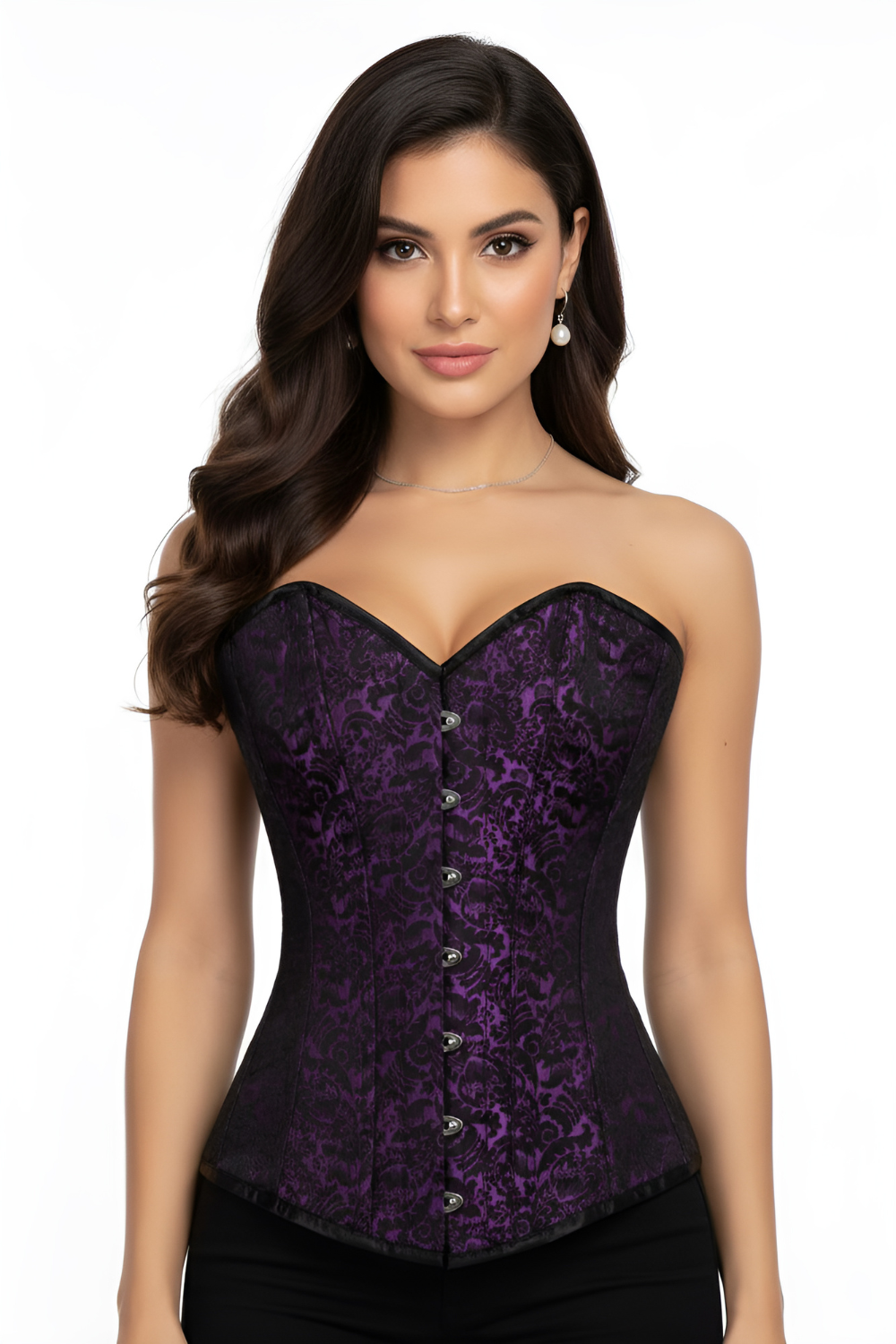 A Classic Longline Purple Brocade Steel Boned Overbust Corset designed to shape the waist and to achieve your ideal figure with up to 2 inches waist reduction. This premium quality instant shaper is perfect for enhancing those curves and is suited to a longer torso. Highly recommended by Black Widow store employees