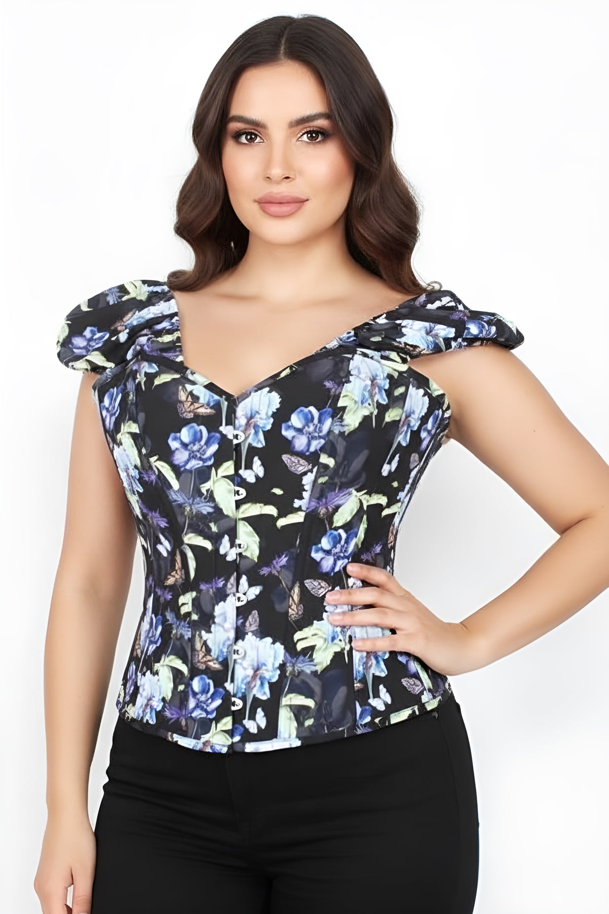 This stunning vintage style floral corset with ruffled sleeves looks absolutely stunning and is highly recommended by our store members of staff. This gorgeous garment with a wonderful print is ideal simply for a casual night or even for a more formal setting. It is also great for shaping the waist & enhancing those curves.