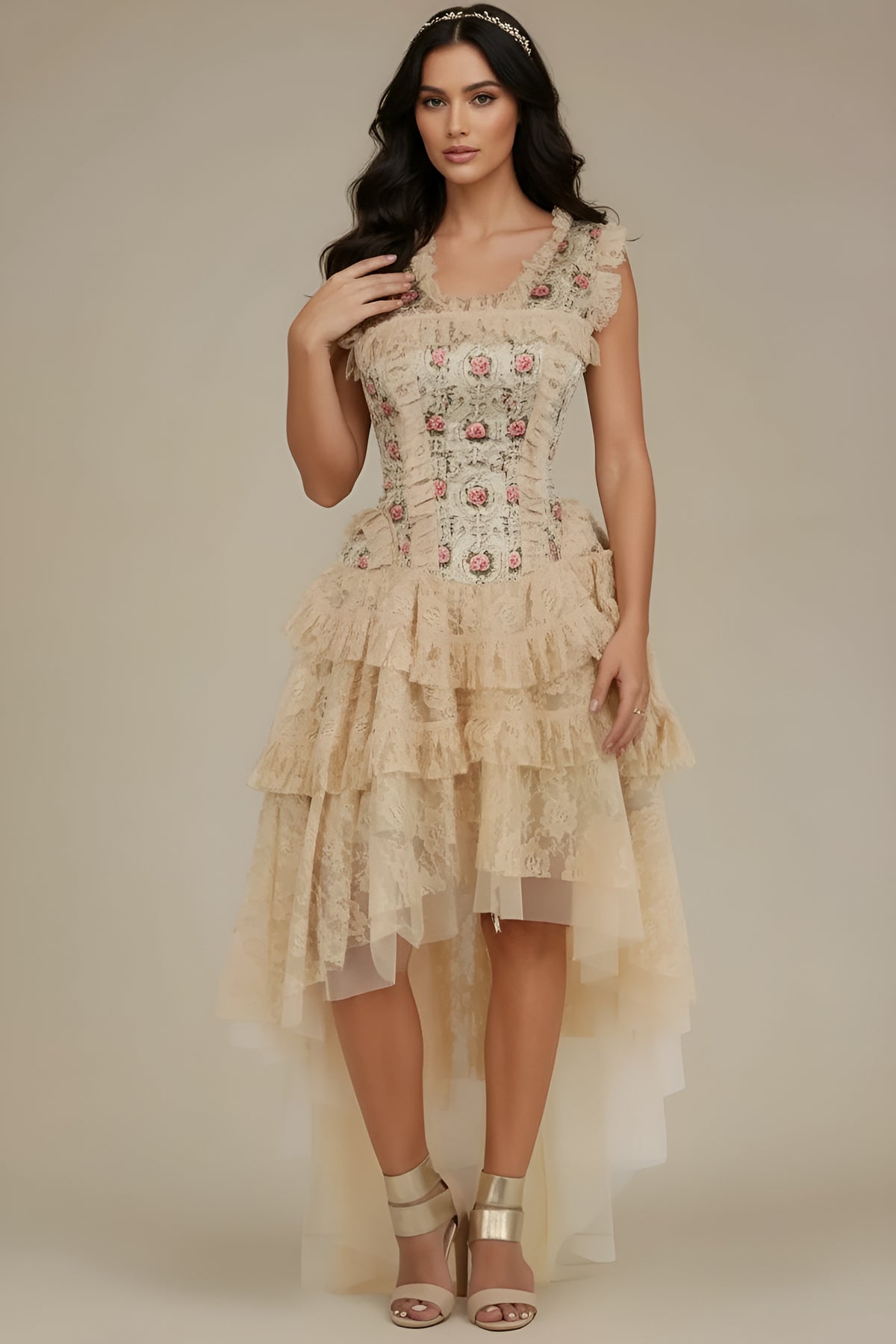 This Rose Floral corset dress features a structured floral-print bodice adorned with delicate pink roses and trimmed with soft beige ruffles for a truly feminine silhouette.