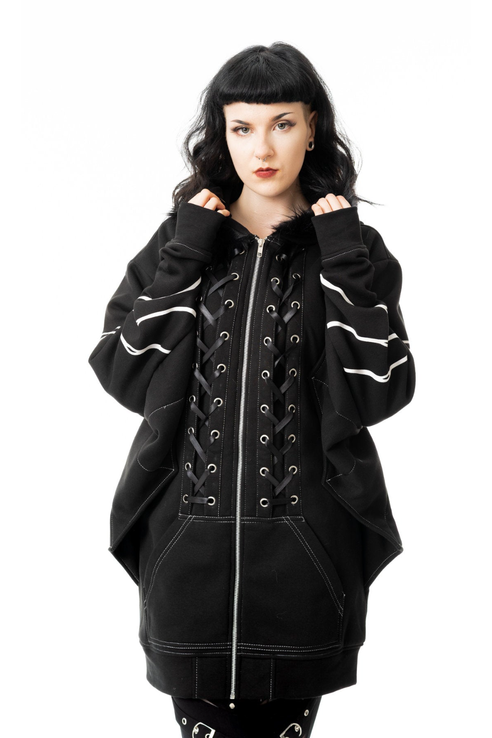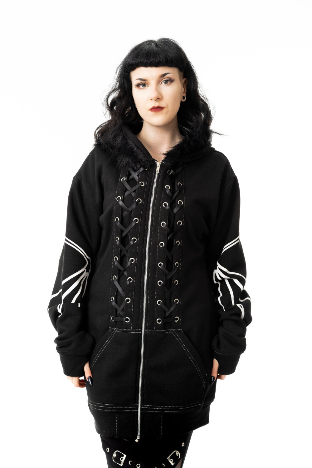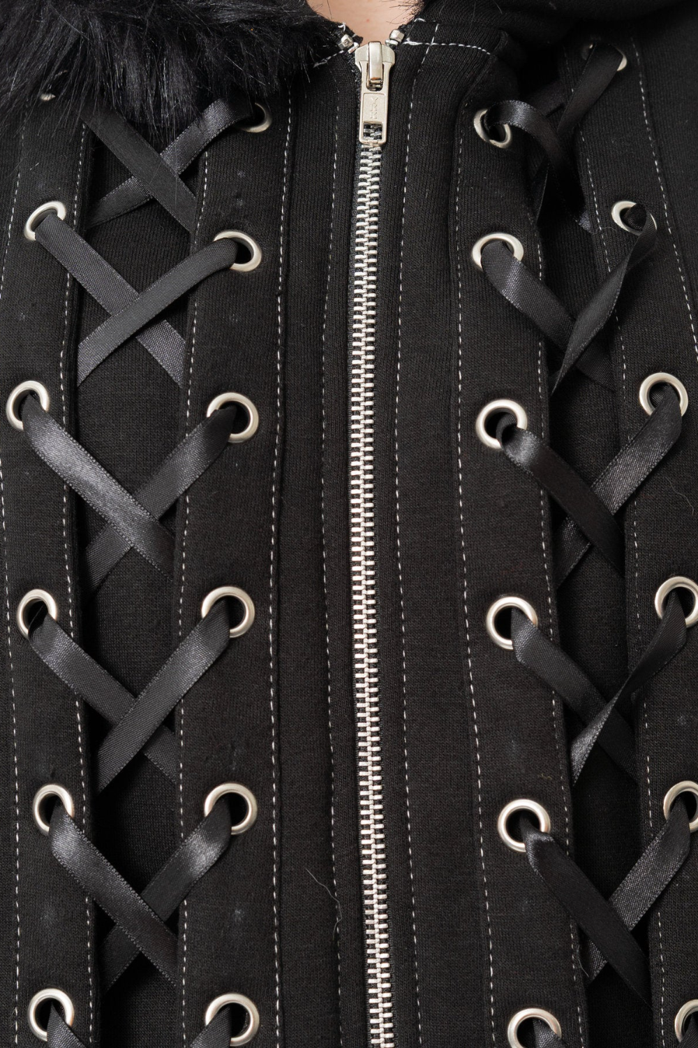 Fastened by a handy zip and features two long, vertical strips of criss-crossing laces for a unique and alternative look.