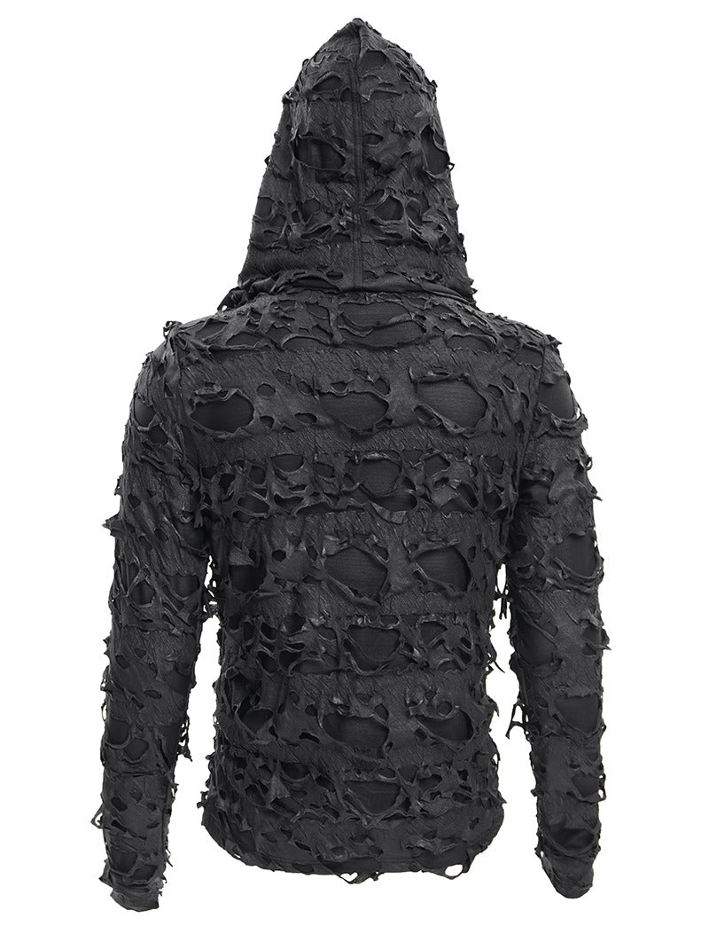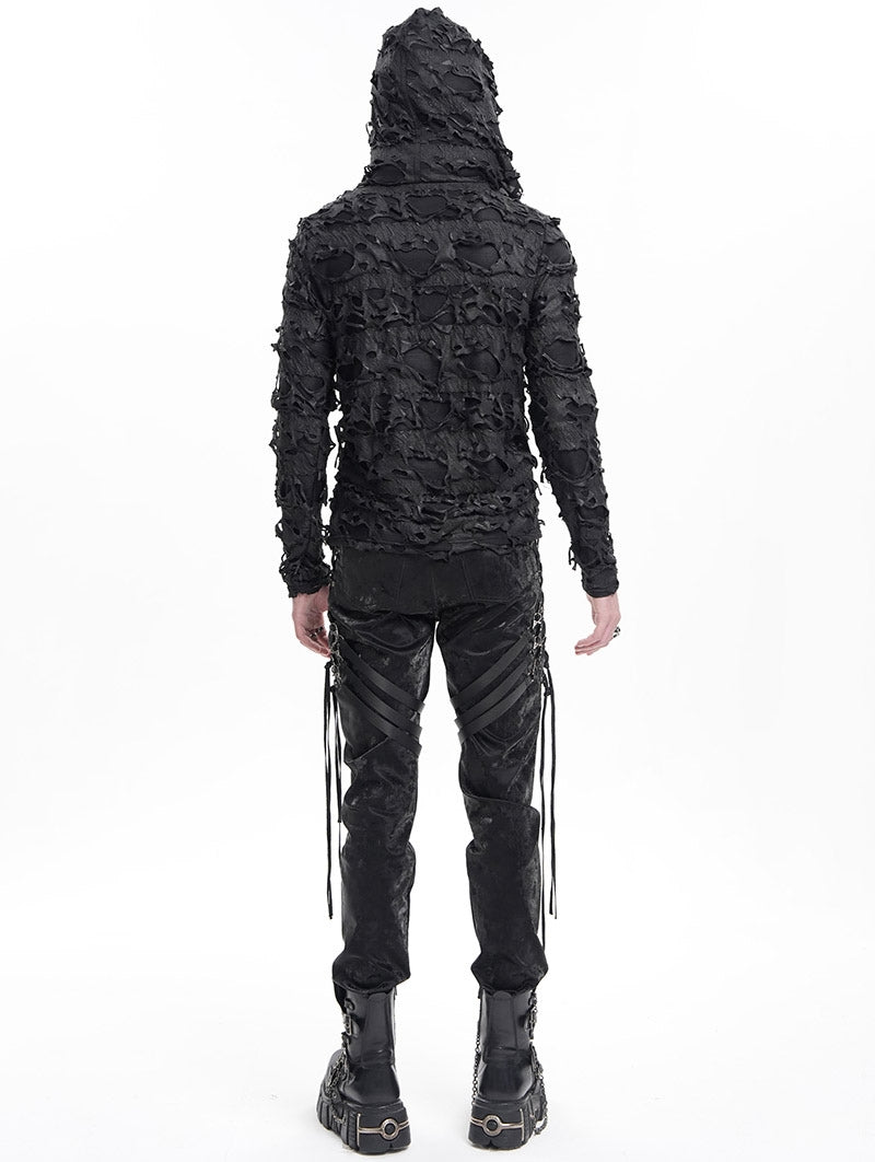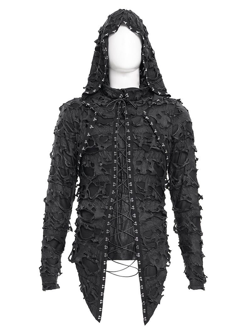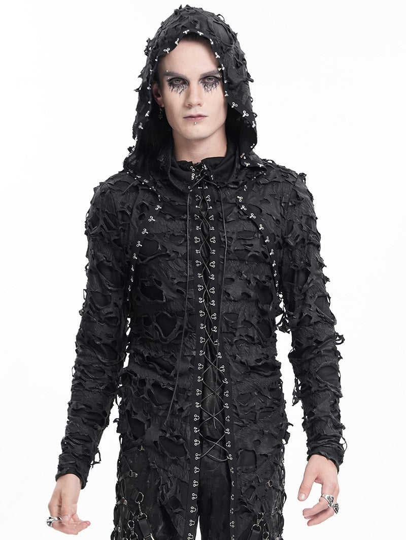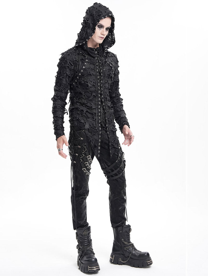 Black Gothic Punk Ripped Lace-Up Long Sleeve Hooded T-Shirt for Men