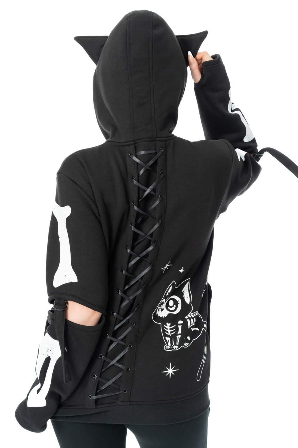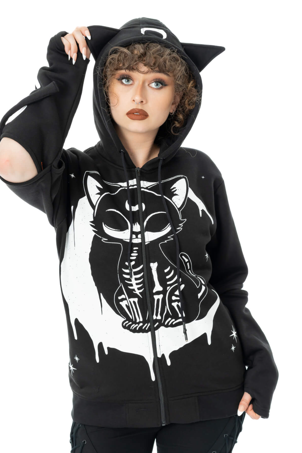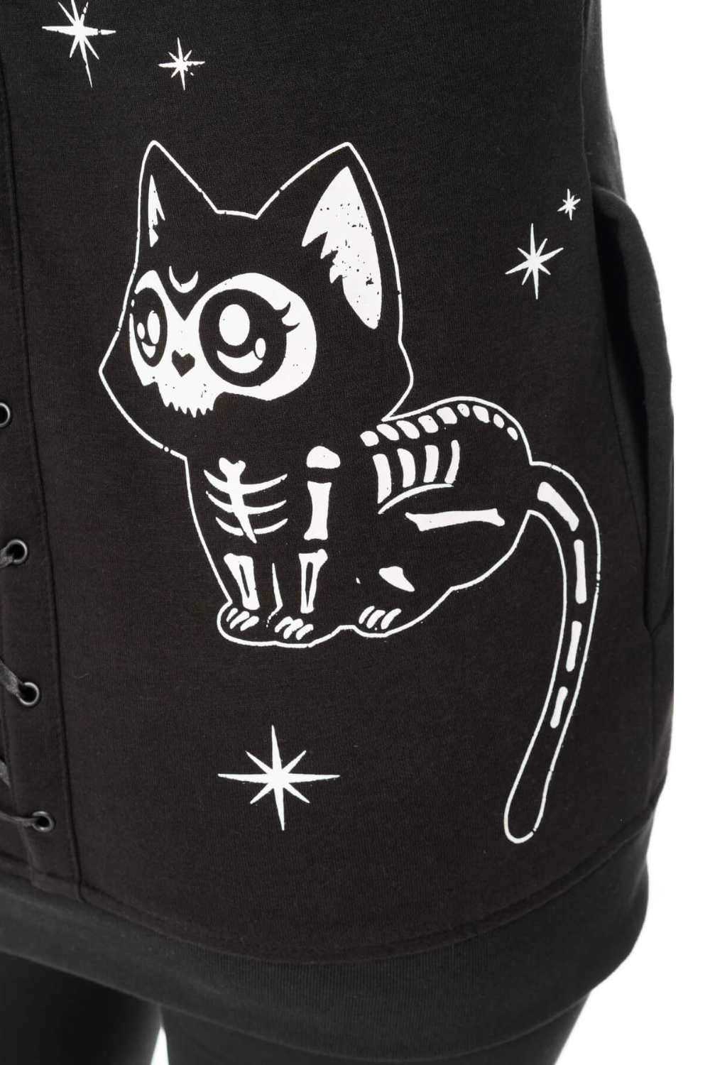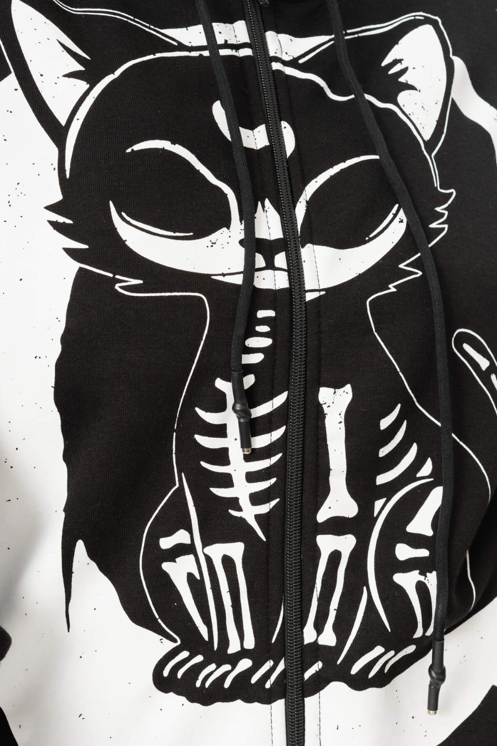 The Moonlight Hood is a cool cosy black zip fastening hoody. The hoodie features a hood with a cute skeleton cat print