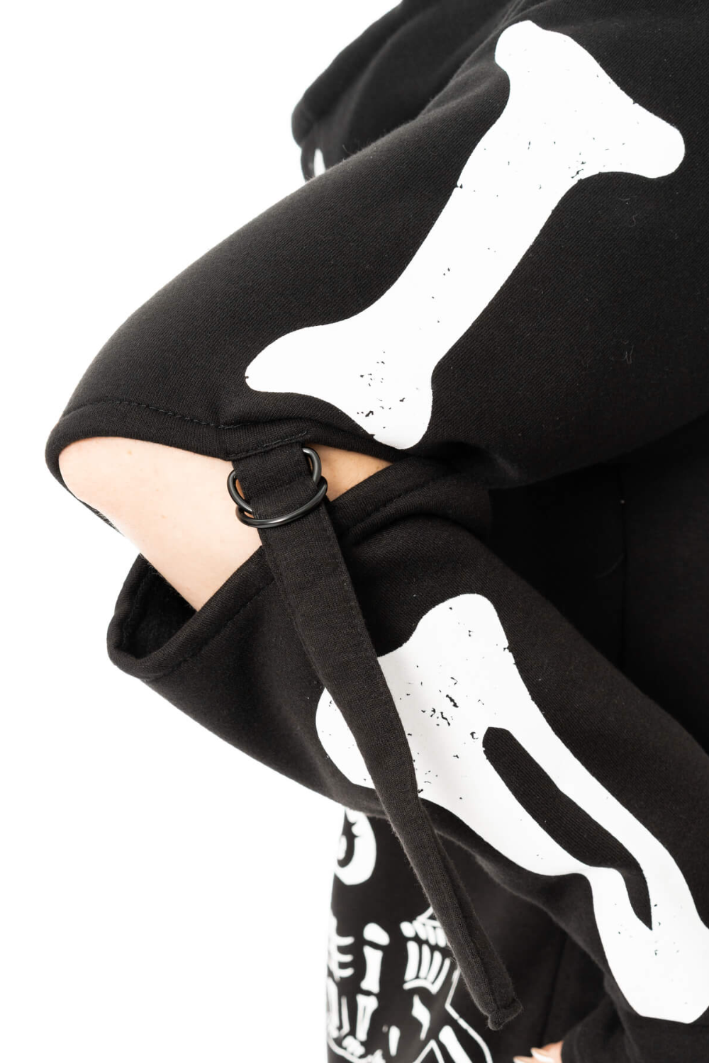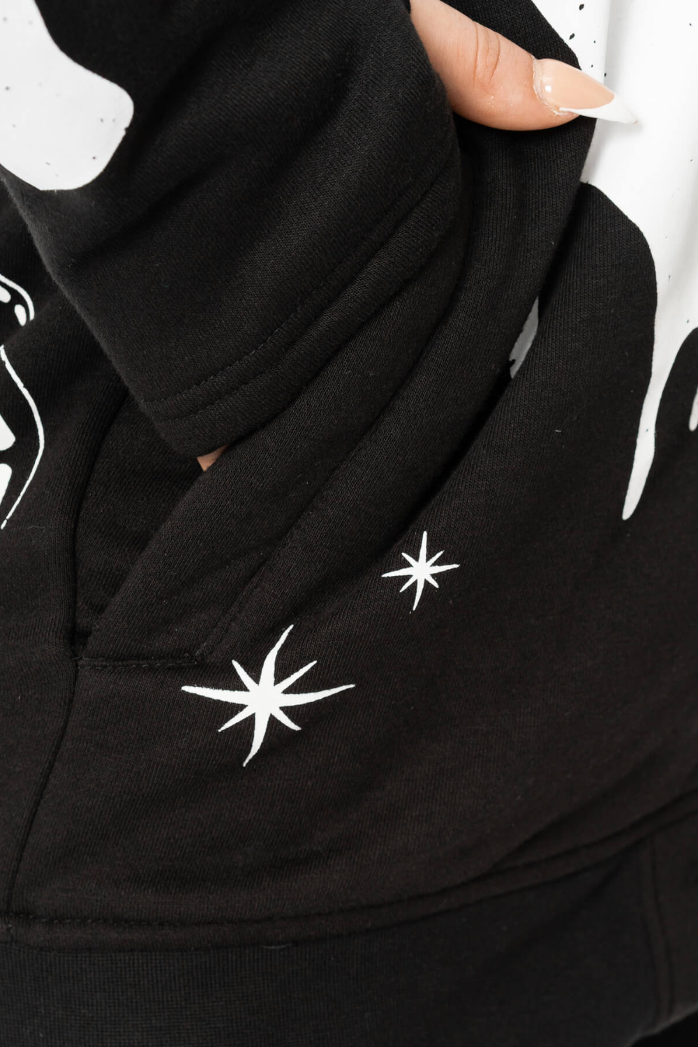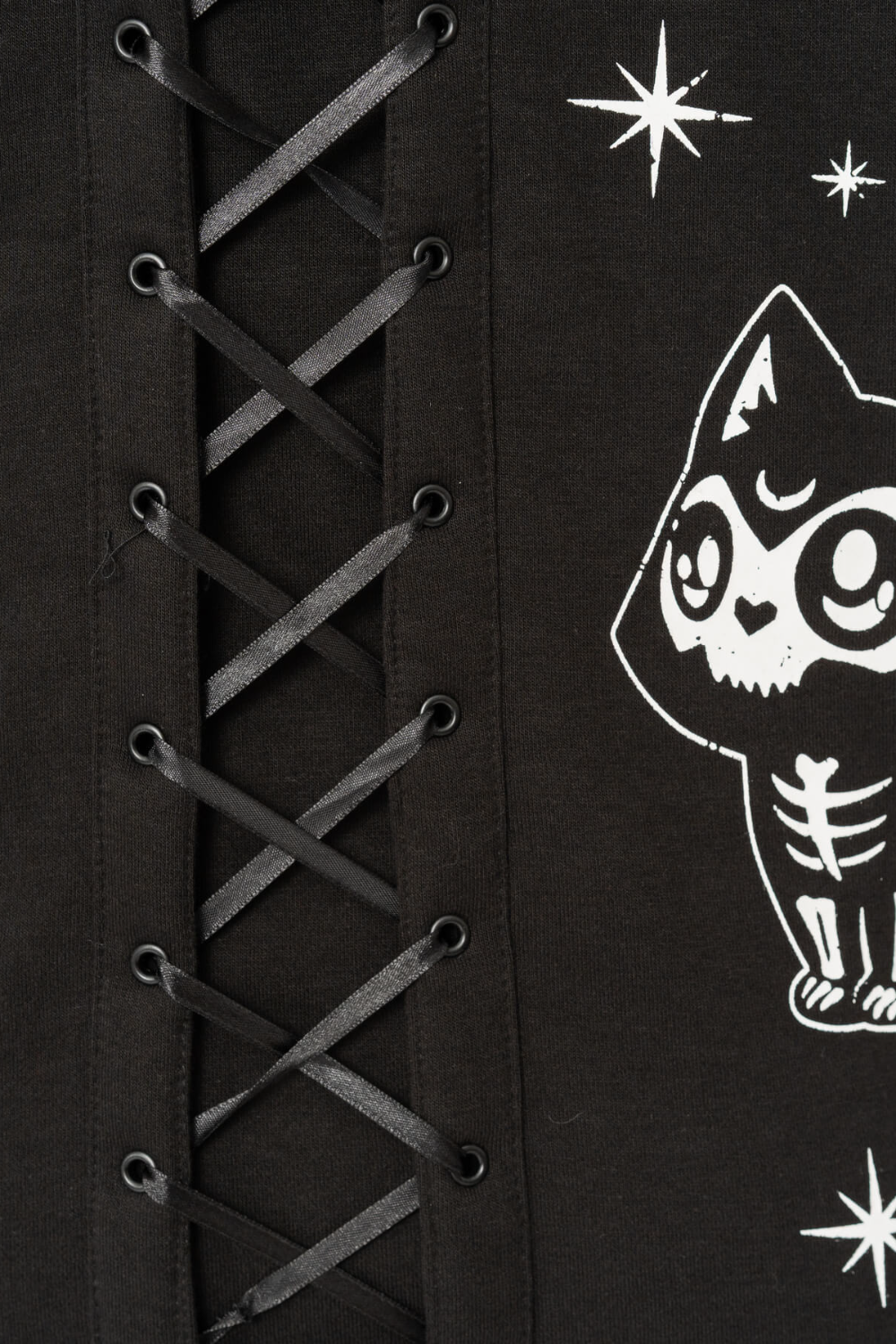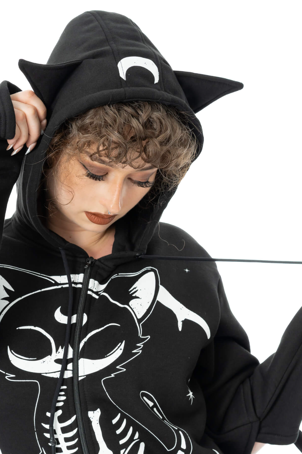 The Moonlight Hood is a cool cosy black zip fastening hoody. The hoodie features a hood with a cute skeleton cat print